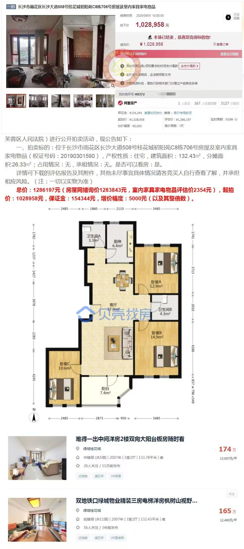 再講下拍房緣分,H阿姨是我公司(湖南法拍網(wǎng)法拍房地產(chǎn)經(jīng)紀(jì)有限公司)第242個(gè)VIP客戶,準(zhǔn)備看法拍房,先關(guān)注的收6-8個(gè)點(diǎn)同行,后面覺得太貴了沒選擇,然后她女兒就刷到我了,就來我們公司了解了,選擇了我們。5月份簽的約,服務(wù)了4個(gè)月,推薦看了不少,參拍了都有7套房子,但是都沒拍到,幾次都是老二,勸一勸也還會(huì)加,可能也早拍到了,但是我們覺得撿漏空間小了,就不勸了,寧愿多拍幾套。前幾天就推薦了這個(gè)桂花城,本來覺得超預(yù)算不太想拍的,但我們覺得房子確實(shí)不錯(cuò)就去看了,拍了照片視頻發(fā)到群里,就還是有興趣,然后臨結(jié)束前一天還是去小區(qū)看了下,還看了下中城麗景香山的露臺(tái)房,然后考慮了下晚上決定拍,當(dāng)天晚上就報(bào)名了,第二天早上就底價(jià)成交了,真的就是緣分。